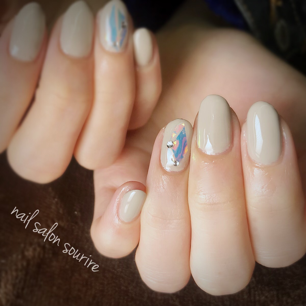 ベースカラーをグレーにしたら落ち着きがあって、何にでも合いそうなネイルに。