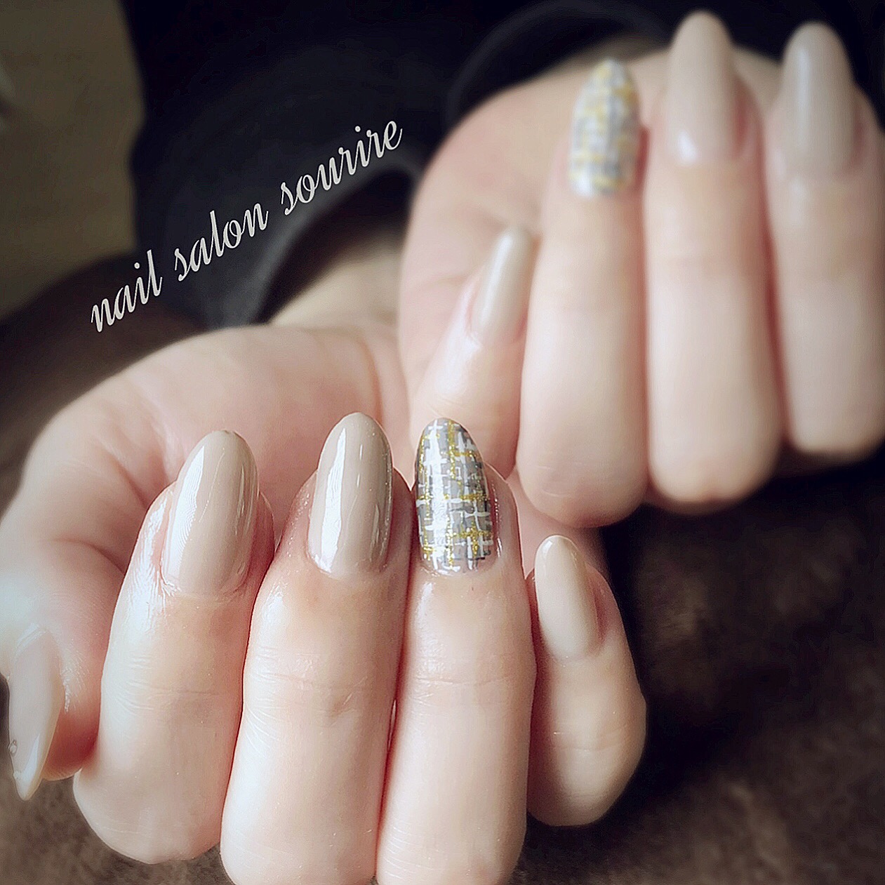薬指にグレーとゴールドとホワイトのツイードと、親指にもゴールドの石とスタッズがついています。